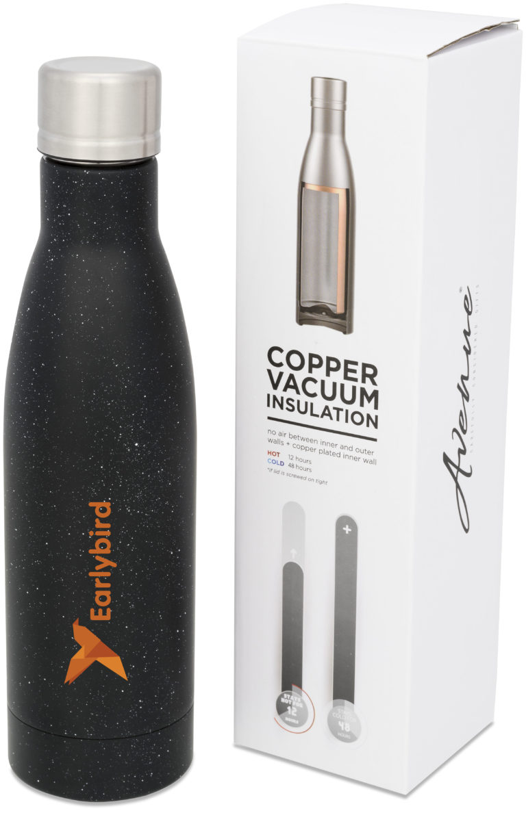 Speckled copper vacuum insulated bottle. Keep your drinks hot for 12 hours or cold for 48 hours with the Speckled copper vacuum insulated bottle. Double walled and made from 18/8 grade stainless steel with vacuum insulation and a copper plated inner wall means your beverage is kept piping hot or ice cold depending on your requirements. The bottle features the on-trend, speckled finish. Volume capacity is 500ml. Presented in an Avenue gift box. Stainless steel.