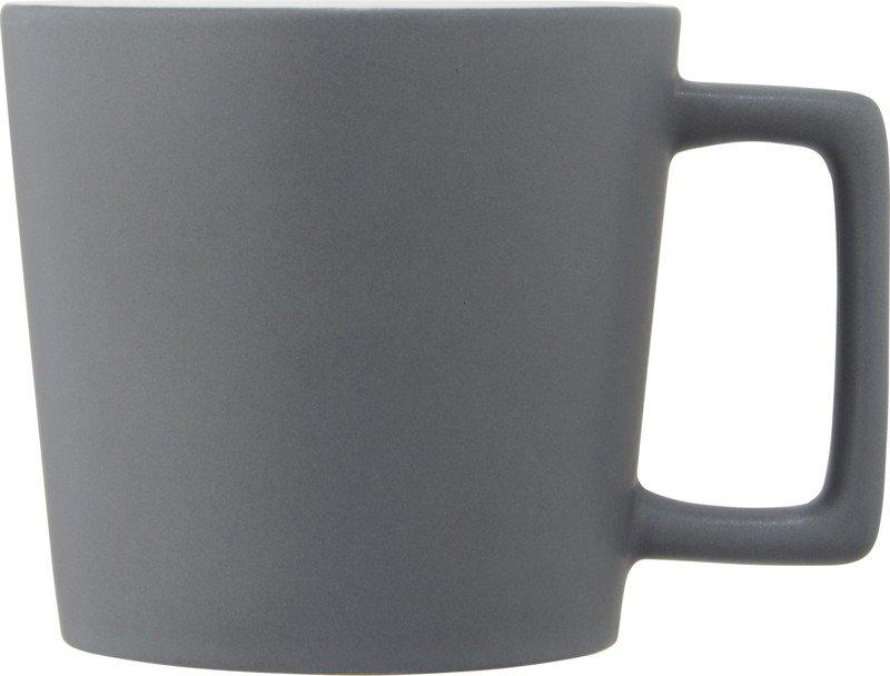 Ceramic mug with a modern design and matt finish. Volume capacity is 370 ml. Dishwasher safe for all decoration methods. Presented in a recycled cardboard gift box.
