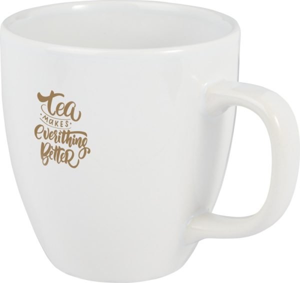 The ceramic mug has a trendy glossy finish adding a sleek touch. It features a large handle that provides a comfortable and sturdy grip. The mug is versatile enough to use with both hot and cold beverages allowing you to enjoy coffee, tea, soup, and more. Volume capacity is 430 ml. Dishwasher safe for all printing methods. Presented in a recycled cardboard gift box.
