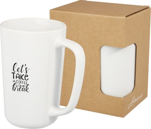 Large contemporary ceramic mug with matt finishing exterior. The Perk mug features a big surface, ideal for maximum logo exposure. Dishwasher safe for all printing methods. Volume capacity is 480 ml. Presented in a recycled cardboard gift box.