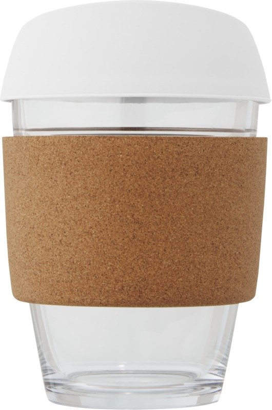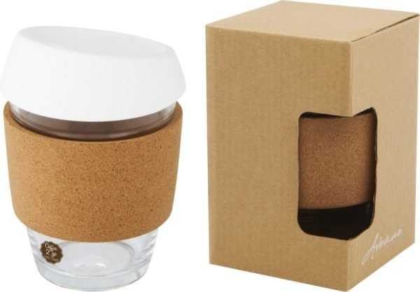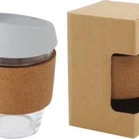 Single-walled borosilicate glass tumbler with a smooth cork grip. Features a removable food safe silicone lid. The thumbler is made from 100% durable borosilicate glass which conserves the freshness of the beverage, and it does not contain any harmful chemicals. Tested and approved under German Food Safe Legislation (LFGB), and tested for phthalates content according to REACH regulations. Fits under most coffee machines, making it the perfect tumbler for work on when on-the-go. Volume capacity is 360 ml. By removing the cork grip the tumbler is dishwasher safe. Presented in a recycled cardboard gift box.