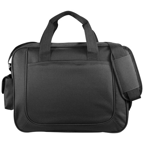 Business brieface. Zippered main compartment with double reinforced top carry handles. Open front pocket. Side accessory pockets and pen sleeves. Adjustable padded shoulder strap. 600D Polyester.