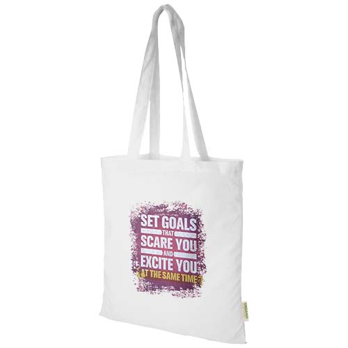 Tote bag made from 100% OCS certified 140 g/m² organic cotton originating from India, featuring a large open main compartment providing plenty of space to carry around all of the essentials. The 32 cm long handles makes it comfortable and easy to carry around wherever you go. Resistance up to 5 kg weight. Volume capacity: 7 litres.