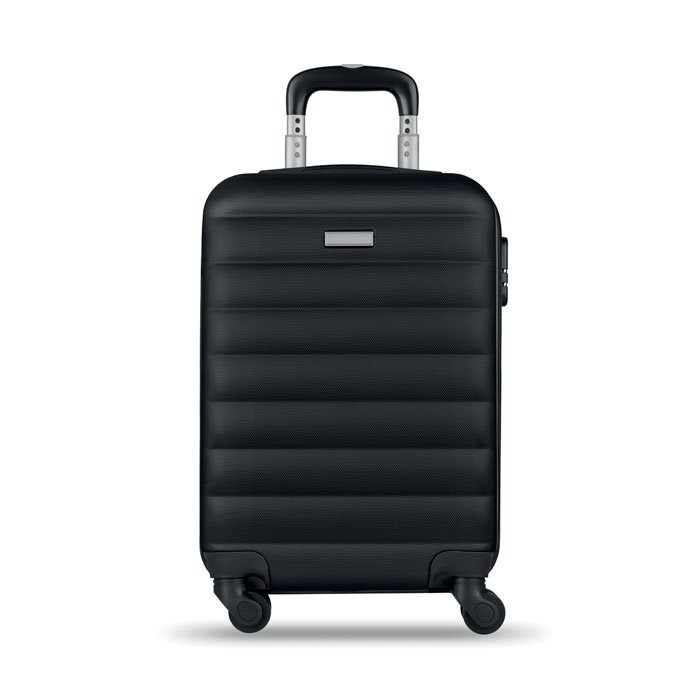 20 inch hard-shell trolley in ABS. 1 main compartment and inner compartment. Includes a security lock. Rides on 4 wheels.