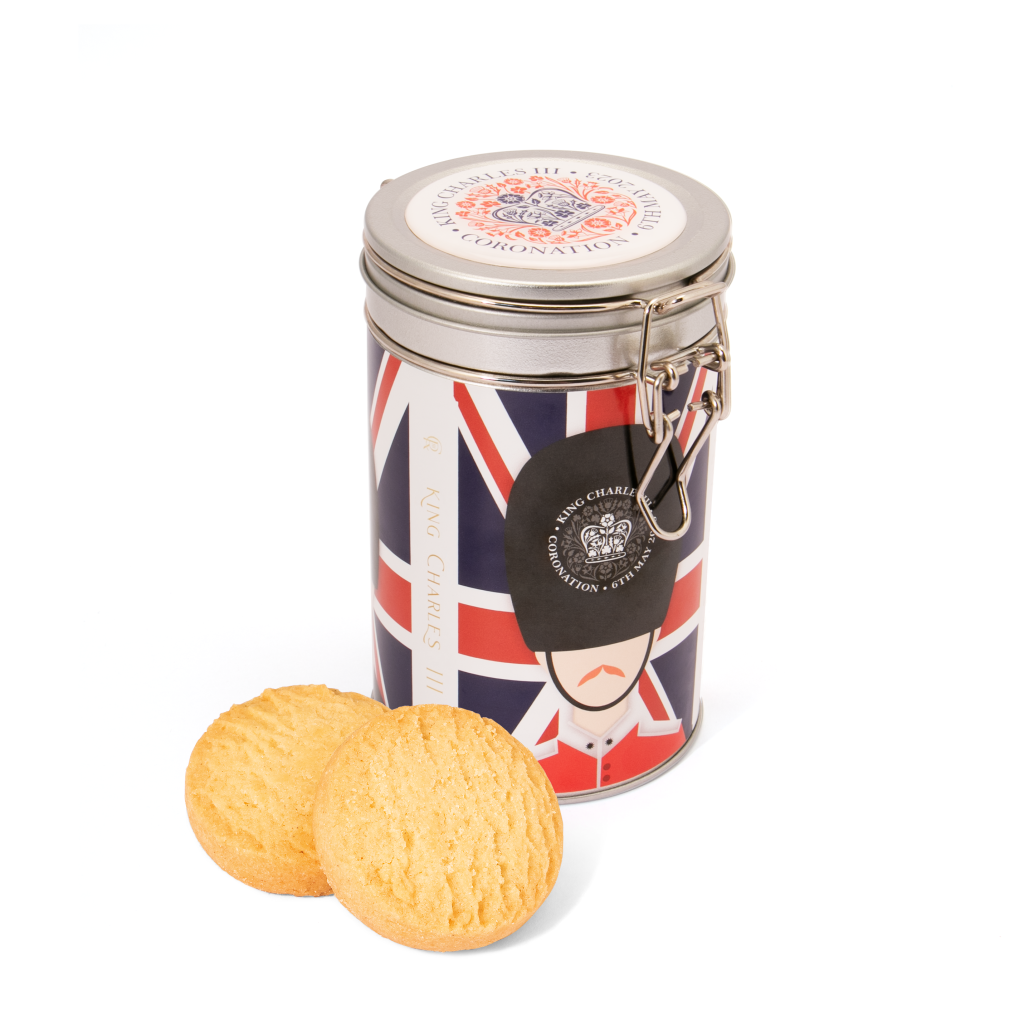 Our silver flip-top tin is filled with delicious mini round shortbread biscuits. Ideal for sharing at an event or on a picnic – the branded shortbread tin keeps contents dry and fresh! The lid features the commemorative Coronation icon and around the outside our customisable Coronation artwork which can be personalised with your own logo or replaced with your own custom design. Once enjoyed the tin becomes a lasting reminder of the Coronation to be refilled over and over again!