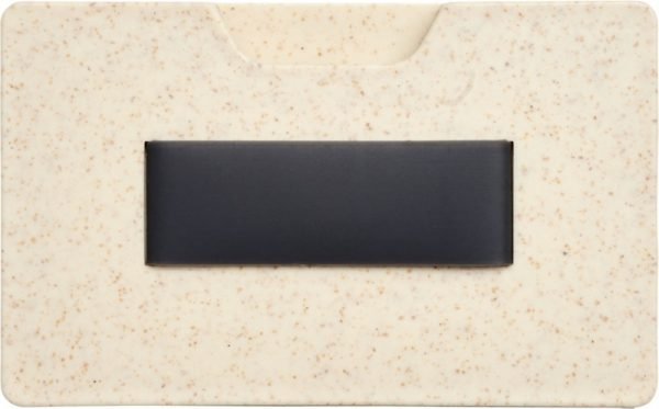A more sustainable choice! This RFID secure card holder can safely contain up to 3 bank cards or IDs and will keep them protected from unauthorized scans and other fraudulent activities. Made of 50% wheat straw. The adhesive tape on the back allows for attaching the wallet to smartphones with a flat back. Comes with a strap for secure carrying. Wheat straw, PP Plastic.