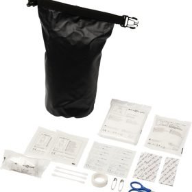 Strong and durable tarpaulin waterproof bag with 30 pieces of first aid supplies. The roll-top closure with plastic buckle ensures that the content is kept dry and safe. Great for watersport and other outdoor activities. First aid kits will help you to perform a simple wound treatment in order to reduce the secondary injuries. A first aid kit is regarded as a medical device and is governed by 93/42/EEC, based on the intended use: “diagnosis, prevention, monitoring, treatment or alleviation of disease”. This medical device belong to CLASS I, Is. Tarpaulin.