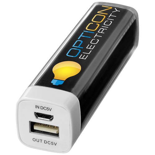 2200 mAh power bank. The 2200 mAh battery capacity provides enough power to charge a mobile device (5V/1A). Power bank charges in 2 hours with included USB cable and turns red when charging, off when charged or blue when fully discharged. Includes white carton box. ABS and PC plastic.
