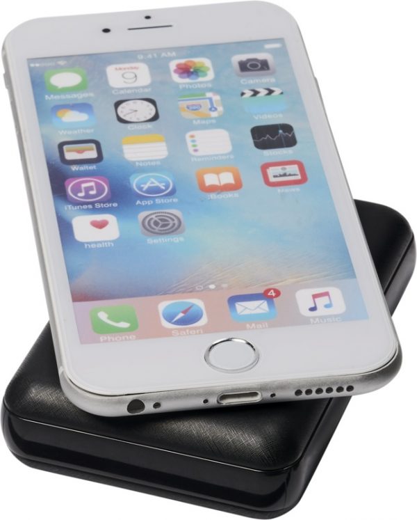 Dense 5000 mAh wireless power bank. This compact power bank features a 5000 mAh grade A lithium polymer battery with a 5V/2A in- and output. Due to its size it’s perfectly suitable for on the go. Supports 5W wireless charging and charging via the USB ports by cable. Wireless charging only works with devices that support it. For devices that don’t support wireless charging, an external wireless charging receiver or receiver case is required. ABS Plastic.