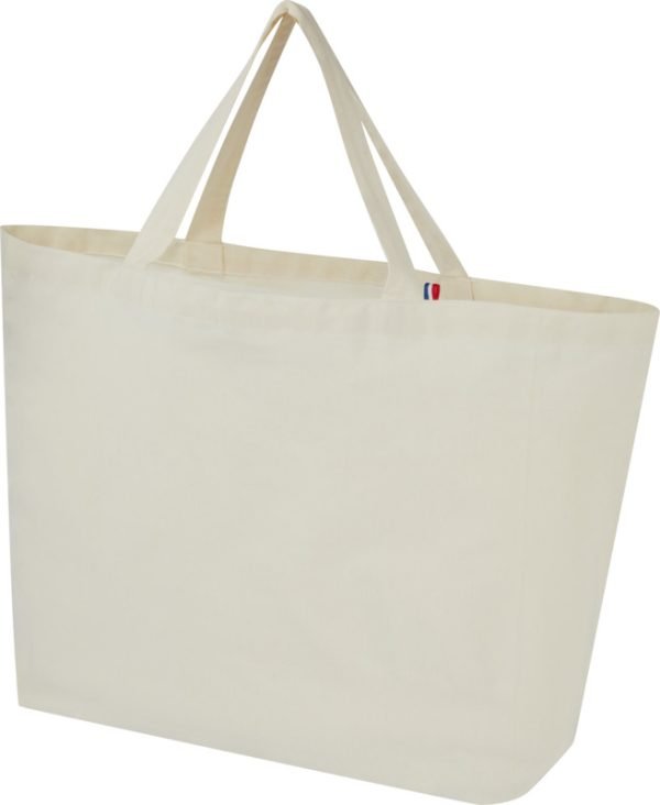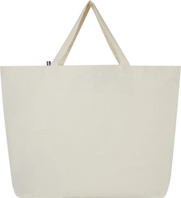 This large capacity tote bag is made with the finest, 100% recycled materials. It is constructed to use in everyday life, and suitable to carry around heavy books or groceries. The 200 g/m² recycled cotton/polyester blend ensures durability and reliability, giving the bag a resistance of up to 14kg weight. The yarns originate in Asia, but the weaving, spinning and manufacturing is all done in France.