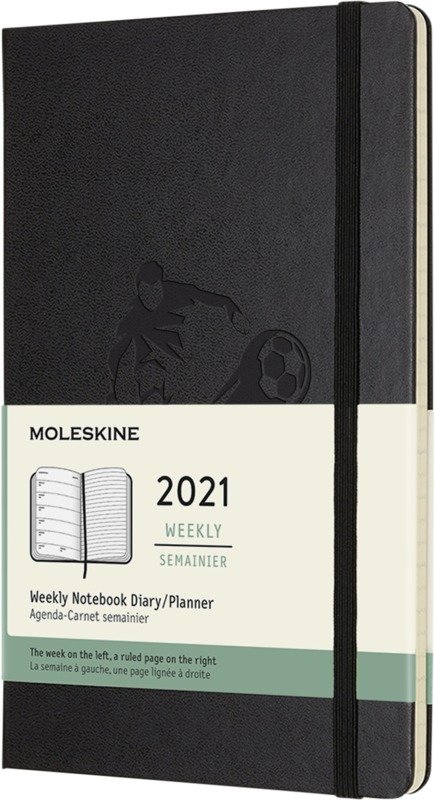 Hard cover Moleskine weekly planner for January to December 2024, formatted to show the week’s appointments on the left and a ruled page for notes and ideas on the right. Features 70 g/m² ivory-colored acid-free paper, a black elastic closure, page ribbon marker, and an expandable inner pocket. Leatherette paper.