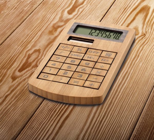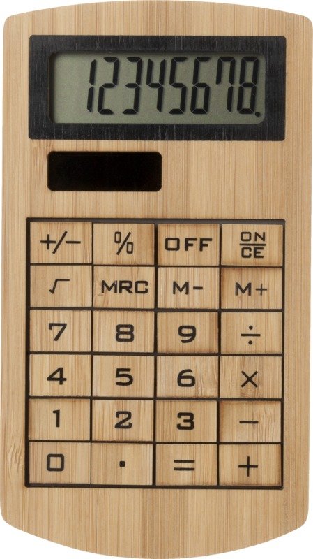 8 digit eco-friendly bamboo calculator. Works on solar power. Bamboo wood.