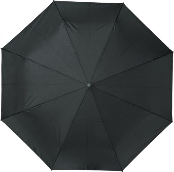 Automatic open and close folding umbrella with a recycled PET pongee polyester canopy. Sturdy metal shaft, a high quality frame with fibreglass ribs offering maximum flexibility in windy conditions. Supplied with a pouch and can easily fit a handbag or backpack for convenient carrying. Together with the wooden handle and the recycled PET pongee polyester canopy it offers a sustainable choice. Available in an wide variety of contemporary colours with a large decoration area on each of the panels, and the wooden handle can be decorated too. Recycled PET Pongee polyester.
