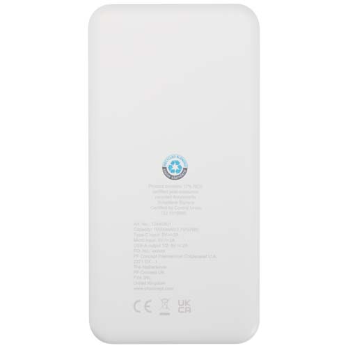 Stay charged with the 10.000 mAh power bank, made from recycled plastic. It features two USB-A output ports, a Type-C input/output port, and a micro-USB input for flexible charging options. The sleek design includes an LED indicator to display charging status, making it a reliable power source throughout the day.