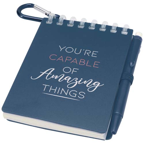 The Mini notebook and pen set is a compact and practical companion for on-the-go note-taking. The spiral-bound notebook has a soft recycled plastic cover and 70 blank sheets of 120 g/m² water-resistant stone paper, making it ideal for outdoor use. With rounded corners and a built-in pen loop, it embraces the mini-size trend while remaining functional. The matching ballpoint pen is made from recycled ABS plastic, writes in black ink, and offers a writing length of 250 metres. A colour-coordinated metal ring allows the set to be easily attached to a backpack, purse, or keychain, making it perfect for durable and portable note-taking. Notebook size: 11 × 7.5 cm.